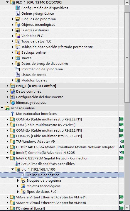 Al establecer la conexión, podemos ver el PLC ONLNE en los accesos ONLINE del proyecto, con su dirección IP asignada y sus características.