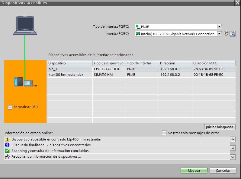 Puede que esto nos aparezca porque la dirección IP del PLC era diferente en el PLC y en nuestro proyecto. Ahora le hemos transferido el nuevo hardware y, por lo tanto, la dirección IP ha vuelto a cambiar. Como consecuencia de esto, tenemos que volver a buscar los dispositivos accesibles, y nos mostrará el PLC con la nueva dirección IP.